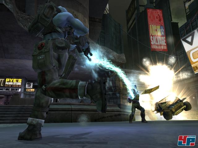 Gleichauf wiederum liegen die Systeme, wenn es um die Animationen geht, die sich durch die Bank als grundsolide präsentieren – das Schmuckstück ist natürlich Rogue samt Biochips. Immer wieder entdeckt man kleine, aber feine Details, die den Comic zu überzeugendem Leben erwecken. So z.B. der mechanische Arm des Rucksacks, der Schrott sammelt oder Rogue eine Spritze in den Arm jagt. Deutlich schwächer, aber immer noch nett anzuschauen, sind die Bewegungen der Gegner, die allerdings auf Dauer Verschleißerscheinungen zeigen. Bei der grundsätzlichen guten Physik und den sich daraus ergebenden und von verschiedenen Trefferzonen unterstützten Ablebeanimationen schleichen sich aber immer wieder unschöne Fehler ein. Mal schwebt ein Nort steif wie ein Brett auf einem Abhang, ein anderes Mal clippt er durch die Hauswand durch, weil die Kollisionsabfrage sich entschließt, einen Abgang zu machen.