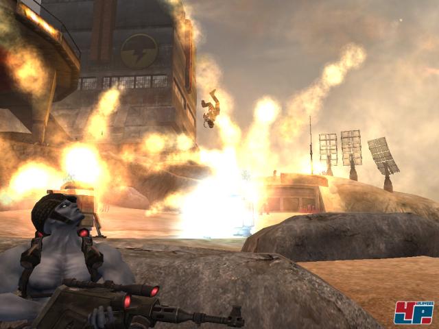 Doch das ist nur die halbe Wahrheit. Denn auch wenn Rebellion in keiner Form an den Grundfesten der Third-Person-Action-Bibel rüttelt und mit Sniper-Einlagen, stationären Geschützen, einem breiten Spektrum an Schießprügeln und diversen Granaten und Minen sowie den obligatorischen Nahkampf-Attacken nichts bietet, was man nicht auch irgend wo anders finden kann, offeriert der blaue Comic-Rambo unter dem Strich doch alles etwas anders als die Konkurrenz: Rebellion hat es geschafft, dem Spieler mehr Freiheit zu bieten als man es von herkömmlichen Genre-Kollegen gewohnt ist.