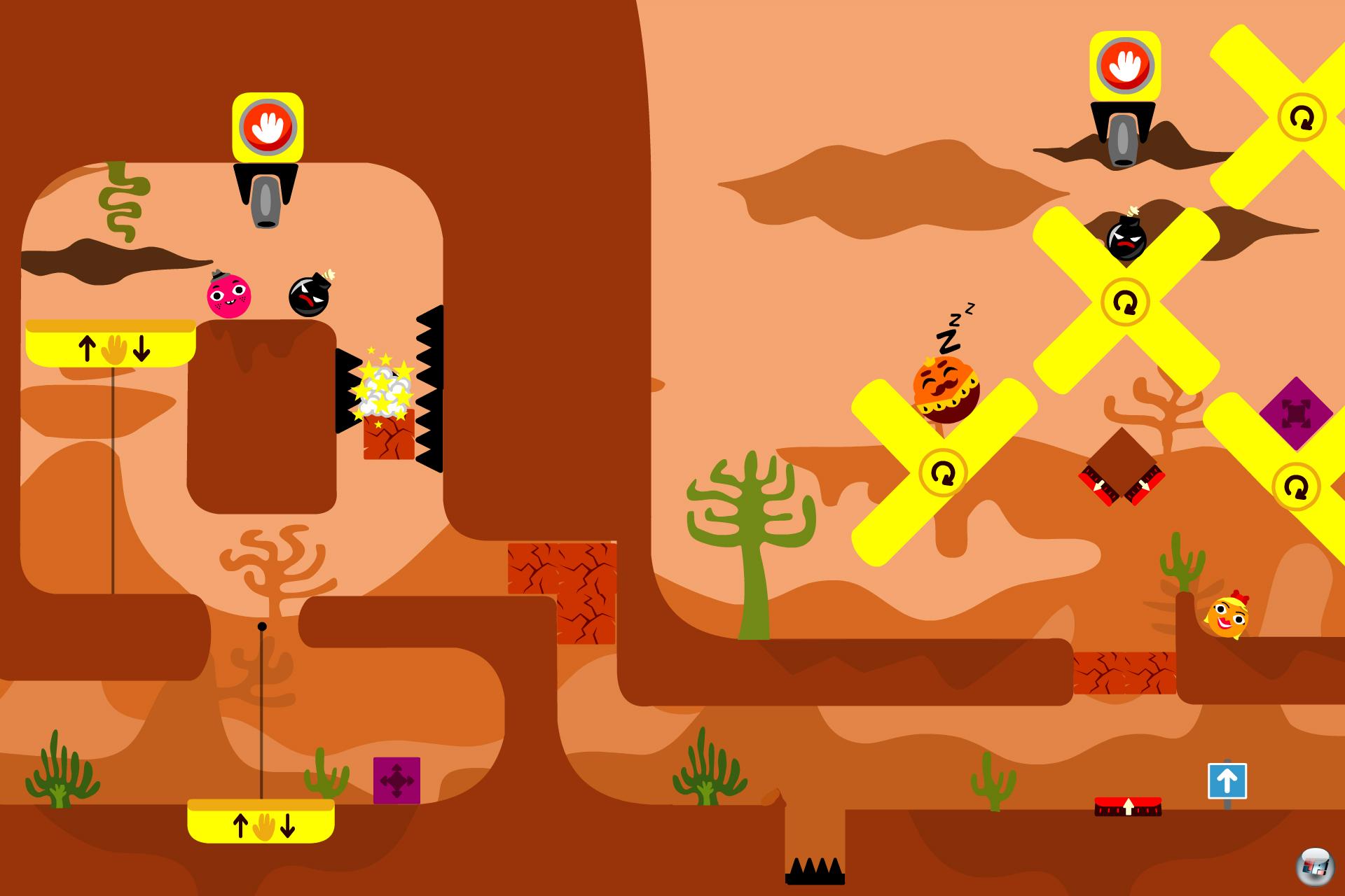 Aber wieso sollte man sich überhaupt um die Rätsel kümmern? Weil sich bei Rolando alles darum dreht, dass man überhaupt zum Ziel gelangt. Lediglich offen sichtbare (man kann den gesamten Level von Beginn an einsehen), aber schwer zugängliche Diamanten sorgen für zusätzliche Kopfnüsse. Der gerade Weg zum Ziel ist hingegen ein Hindernislauf über gefährliche Zacken, an mies gelaunten Bösewichtern vorbei und über blubbernde Lava hinweg. Und so kippt man den iRoll nach links und nach rechts, woraufhin die Rolandos der Physik folgend in die entsprechende Richtung murmeln. Streicht man zwischendurch mit dem Finger gerade nach oben, hüpfen die Kugeln und in freischaltbaren Geheimlevels kann man den Bildschirm sogar auf den Kopf drehen – mit entsprechenden Auswirkungen auf die Schwerkraft.