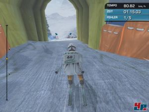 Die Steuerung wendet sich ebenfalls an Einsteiger, denn sie kommt mit ganzen drei Tasten aus. Ihr steuert mit den Pfeiltasten und springt mit Space ab; schon das Kanten ist mit den modernen Carvingski meistens gar nicht mehr nötig. Bei der Konkurrenz von Ski Racing 2006 müsst ihr da schon weit mehr Testen zur Beherrschung lernen. Die Bedienung ist simpel, exakt und butterweich, was dafür sorgt, dass euer Profi nur in Ausnahmenfällen im Fangzaun landet. Verletzungen braucht ihr ohnehin gar nicht zu fürchten, denn auch nach schlimmsten Stürzen steht ihr anschließend wieder oben im Starhäuschen, als wäre nichts gewesen. Wer den richtigen Rhythmus für einen steilen Slalomhang findet, kann höchst elegant ohne Fehler ins Tal kurven. Abfahrt und Super-G machen allerdings noch mehr Spaß. Beim Start müsst ihr den richtigen Zeitpunkt abpassen, um abzuspringen, der dann in Prozenten angegeben wird. Wahlweise könnt ihr auch ein Gamepad verwenden.