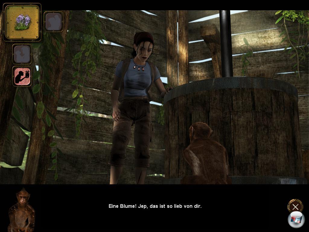 und man spielt fortan Mina, die Jep auf die Schulter genommen hat, wofür es übertriebenerweise sogar ein extra Menü gibt. Der Rest läuft in Egosicht und man sieht, dass man etwas höher steht als der Affe für sich. Ansonsten ist die Insel aber weniger realistisch als vielmehr fantastisch, denn die beiden finden allerhand komische Maschinen, für die es keinen Besitzer zu geben scheint. Gehörten sie einst Kapitän Nemo? Dann muss man einen Roboter reparieren, was doch etwas komplexer ist als die Aufgaben, die sonst so anstehen. Echte Kopfnüsse sind eher selten; meist reicht es, wenn man die richtige Sache am richtigen Ort anbringt.