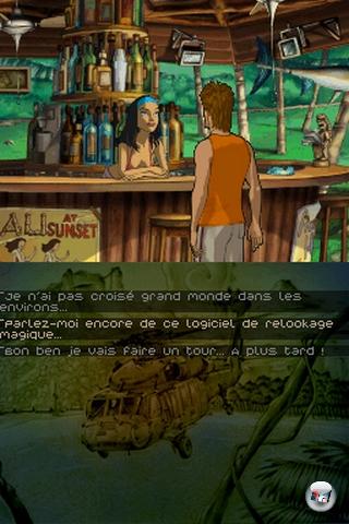 Was für eine Frage – Rätselfutter für die grauen Zellen natürlich! Keine Bange, auch diese essentielle Adventure-Zutat haben die Entwickler nicht vergessen. Es gibt beinah mehr Kopfnüsse zu knacken als alberne Textzeilen zu lesen. Das Spiel ist übrigens keine Exklusiventwicklung für Nintendos tragbare Konsole, sondern feierte bereits vor rund einem Jahr auf dem PC Premiere. Unseren Test zum Original findet ihr hier. Ihr stürzt in der Rolle des ewigen Studenten Brian Basco über einer tropischen Insel mit dem Flugzeug ab. Seine Freundin habt ihr schon ein wenig früher aus dem Flugzeug geschubst – selbstverständlich nicht, ohne ihr vorher einen Fallschirm auf den Rücken geschnürt zu haben. Ihr landet allerdings an einer anderen Stelle im Dschungel und müsst euch durch das vermeintlich undurchdringliche Dickicht rätseln.