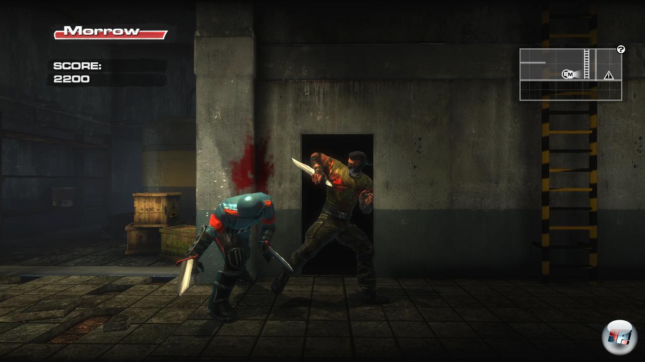 Zwar ist Rush’n Attack: Ex-Patriot (EXP) eine Mischung aus Action und Schleichen, aber Letzterem wird generell der Vorzug gegeben: Man hat die Möglichkeit, sich in dunkle Spalten (die im Boden, an der Decke oder an Wänden sein können) zu verstecken und vorbeischlendernde Gegner von hinten zu erledigen – wenn sie allerdings sehen, wie man sich direkt vor ihnen in ein dunkles Loch verzieht, zerren sie einen raus. Ein großer Teil der Spielzeit geht allerdings für das Finden des richtigen Weges drauf: Das aktuelle Missionsziel wird auf der größer einblendbaren Minikarte angezeigt, der Weg dahin ist allerdings nicht immer offensichtlich – dabei ist EXP allerdings deutlich linearer als z.B. Shadow Complex <a class="DYNLINK" onmouseover="DynToolTipp_Show('Klicken für Gameinfos‚)“ onmouseout=“DynToolTipp_Hide(); “ href=“javascript:DynCont_Display(‚Gamefinder‘,’runmod.php?sid=%7BSID%7D&LAYOUT=dyncont_gf&spielid=364788′)“>