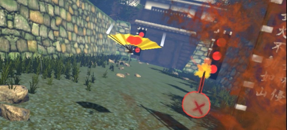 Doch in meinen kühnsten Träumen hätte ich mir nicht ausmalen können, was mich hier letztlich unter der Brille erwartet. Ich sitze z.B. auf einem Pferd, das schnurstracks einem vorgegebenen geraden Pfad folgt, der u.a. von nicht besonders schick aussehenden Kirschbäumen in voller Blüte gesäumt wird. Mit dem Katana in der rechten bzw. den Wurfsternen in der linken Hand kann, nein: muss man nun am Wegrand platzierte Hindernisse in Stücke zerlegen. Das können Baumstämme sein oder Laternenpfähle, in anderen Abschnitten auch mal Fische, die aus einem Fluss springen bzw. Bälle, die auf und ab hüpfen. In je mehr Teile man diese Hindernisse nun zerteilt, desto höher steigt der Kombozähler, der sich natürlich auf die Punktzahl auswirkt. Erschwert werden soll die Aufgabe durch Bomben, bei denen man rechtzeitig die Lunte durchtrennen muss oder Geschosse, die auf einen zurasen. Wobei „rasen“ als Begriff diskussionswürdig ist: Derart langsam habe ich Speere oder Shuriken noch nie in einem Actionspiel fliegen sehen. Fuchtelzeug aus der untersten Schublade