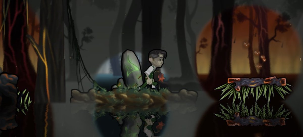 Ohne das sprechende Irrlicht, auf das der namenlose Protagonist gleich am Anfang trifft, wäre die Reise schnell vorbei. Denn erst der per Knopfdruck aktivierte Leuchtkegel offenbart die nötigen Plattformen und Wege einer anderen Dimension, ohne die ein Vorankommen nicht möglich wäre. Die Mechanik erinnert an das Umschalten zwischen den Welten in Giana Sisters: Twisted Dreams. Mit dem Unterschied, dass die etwas sparsam gehaltene, farbarme Kulisse zusammen mit groben Animationen längst nicht so beeindruckend aussieht und auch die passende Musikbegleitung weder die Qualität eines Chris Hülsbeck erreicht noch auf die Dimensionswechsel reagiert. Hinzu kommt, dass sich hier tatsächlich nur ein kleiner runder Ausschnitt um die Lichtquelle herum verändert, der sich mit steigender Kraft zunehmend vergrößert. Steht am Anfang nur ein grünes Licht zur Verfügung, in dessen Strahlen sich sogar der ergraute Vater mittleren