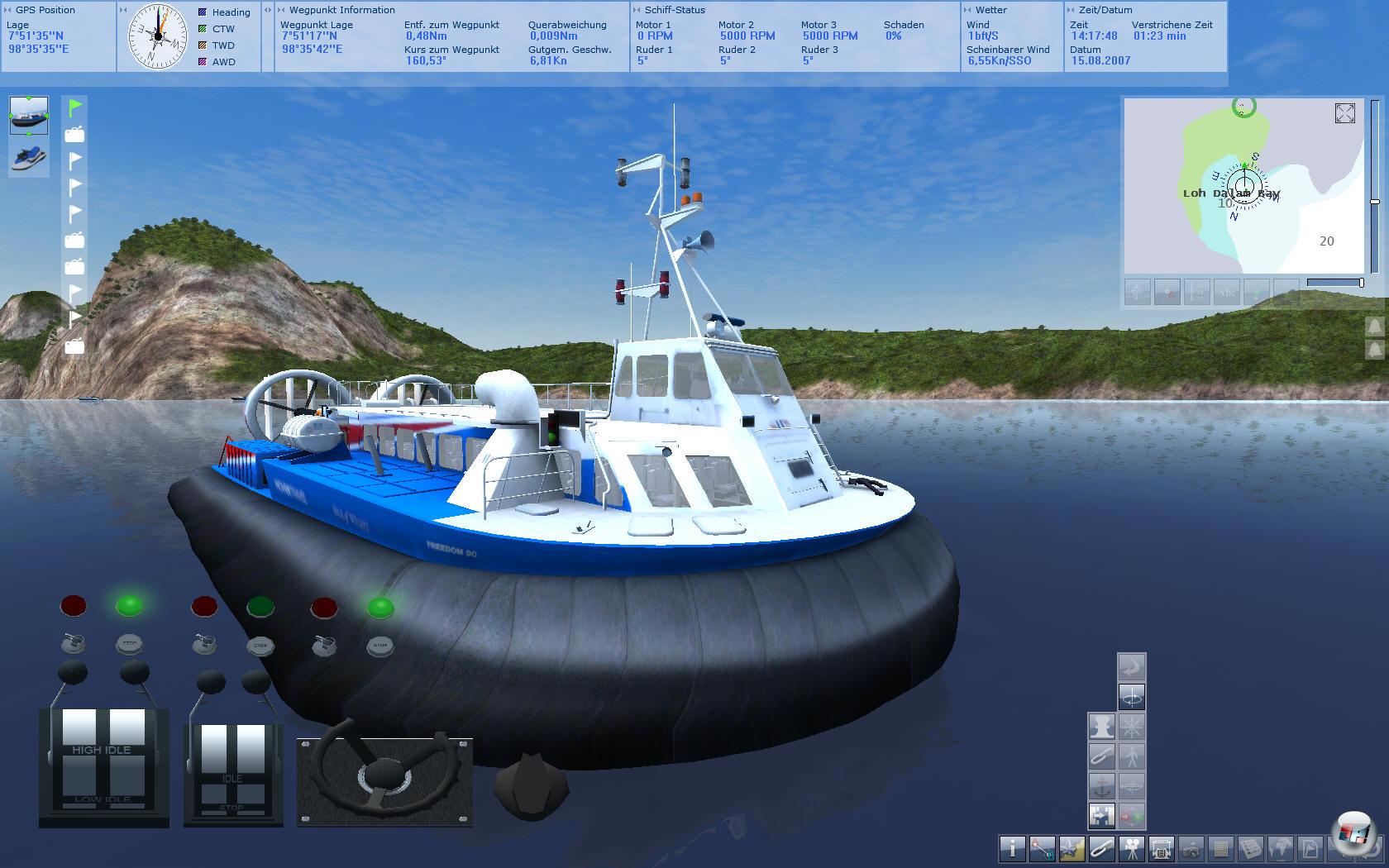 Zugegeben: Wenn ich mit einem kleinen Motorboot eine Jacht abschleppen soll, muss es auch eine kleine Ewigkeit dauern, bis beide Boote endlich Fahrt aufgenommen haben, das ist ja auch realistisch. Auch die Tatsache, dass ein Containerriese praktisch den halben Unterlauf der Elbe zum „Bremsen“ benötigt, bis er aus voller Fahrt zum Stillstand kommt, wurde durchaus korrekt umgesetzt. Doch dann trüben Aussetzer wie von Rampen unrealistisch abhebende Speedboote oder aus unerfindlichen Gründen beim Manövrieren einer Bohrinsel weit auseinander driftende Schlepper das Vertrauen in die Spielphysik doch merklich. Schlussendlich ist die Steuerung im Allgemeinen einfach etwas zu anspruchslos und trivial für eine wirklich glaubhafte Simulation. Bei den Referenztiteln ist z.B. kaum eine Taste frei, viele sind sogar doppelt belegt und so wird mir stets vermittelt Teil eines großen Ganzen zu sein.Hier werden nur wenige Tasten genutzt und auch wenn ich persönlich noch keine Kanalfähre gesteuert habe, so würde ich mich wundern, wenn dies mit zwei, drei Handgriffen zu machen wäre. Es ist nicht an einer Sache festzumachen,