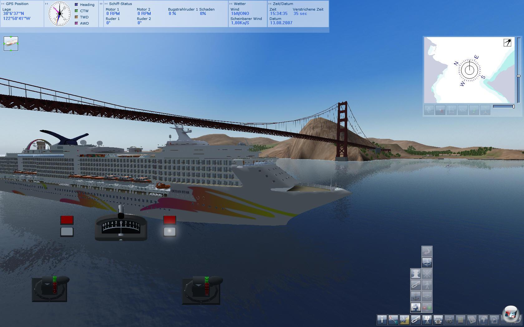 Die Seefahrt besteht aber bekanntlich aus etwas mehr als Hafenrundfahrten in heimischen Gewässern. Da gilt es ganze Kreuzfahrtschiffe der Gegenwart zu manövrieren, mit Bugstrahlmotoren und so genanntem Azimuth-Antrieb (d.h. Schub und Rotation werden gleichzeitig gesteuert). Da kann die altehrwürdige Titanic von England über den Atlantik nach New York navigiert werden, sofern man nicht vorher einen Eisberg rammt, oder man schleppt Öltanker an ihre Anlegestellen.