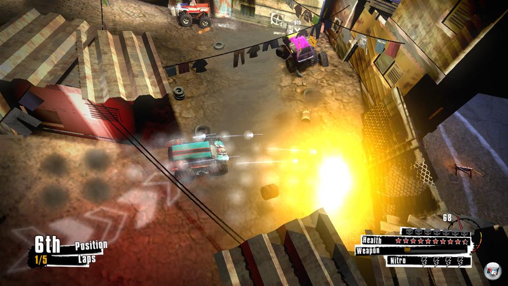 Man ist zwar nicht mit Spielzeug-Karren wie in Micro Machines unterwegs, doch die sehr steile Vogelperspektive ist nicht nur übersichtlich, sondern weckt auch visuelle Erinnerungen an die Mini-Racer von Codemasters.