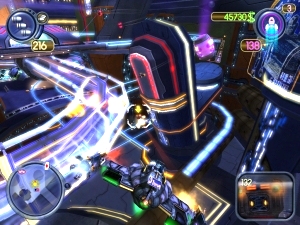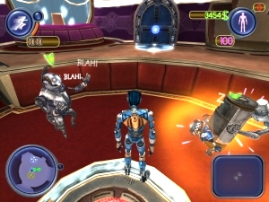 zum Reden bringen, einen Gegenstand finden usw. Während ihr hier zu Fuß (bzw. schwebend oder auf Rollen, je nach Hülle) unterwegs seid, wird die Welt außerhalb der Glasscheiben von Raumflitzern beherrscht: Der Luftraum ist ähnlich vollgestopft wie die Münchner Leopoldstraße zum Einkaufssamstag. Anfangs tuckert ihr noch auf eurem kleinen Standardhobel durch den Äther, doch schon kurz darauf lernt ihr das witzige Vehikelbau-Feature kennen: Ihr bekommt immer wieder mal Blaupausen von Schiffsteilen – Antrieb, Waffensystem oder gar ein komplett neues Design. Diese Vorlagen könnt ihr bei eurem Mechanikerkumpel dazu benutzen, entweder eure Maschine aufzumotzen oder gleich eine komplett neue Kiste aus dem Boden zu stampfen. Das kostet nicht nur Geld, sondern ist auch leicht gemacht: Design gewählt, Waffen und Extras dazugeschaufelt, noch einen letzten prüfenden Blick drauf geworfen, fertig. Das neue Schmuckstück steht ab sofort abflugbereit in eurer mobilen Garage (ein putziger Grinseroboter namens »Spootnik«), ältere Modelle werden nicht recycelt, sondern sind ebenfalls jederzeit verfügbar. Falls ihr es eilig, aber weder Einzelteile noch Kleingeld bei euch habt, könnt ihr auch, ganz in GTA-Manier, einfach eines der in jedem Parkhaus herumstehenden Flugmodelle schnappen und drauflosfliegen. Allerdings könnt ihr mit der heißen Ware nicht viel mehr machen als herumdüsen – als Vorlage für eigene Modelle lässt sich das Diebesgut nicht benutzen, lediglich als Altmetall spült es etwas Geld in D-Tritus notorisch leere Kassen.