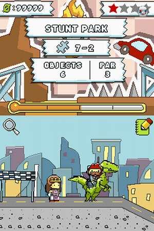 Der Umfang von Scribblenauts fällt enorm aus: Nicht nur das riesige Wörterbuch sorgt für tagelanges Herumprobieren – die Entwickler haben auch nicht an Rätseln gespart. In satten 110 Levels darf ich mir auf jeweils drei verschiedene Weisen den Stern schnappen. Die Reise führt durch Gärten voller Tümpel, das Gebirge, die Stadt, einen Stunt-Park mit allerlei Rampen und Fallen sowie eine ganze Menge anderer Kulissen. Neben diesen »Action-Levels« warten zusätzlich noch 110 Puzzle-Exemplare auf mich, in denen ich eine bestimmte Aufgabenstellung erfüllen muss. Mal soll ich einfach einen Mann in der Wüste erfrischen. Nichts leichter als das: Ich pfeffere dem schwitzenden Touristen eine Wasserbombe an den Schädel und schon ist er glücklich und ich um einen Stern und einige Münzen reicher. In einem anderen Beispiel kleide ich einfach eine Schaufensterpuppe ein.