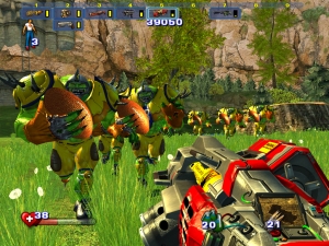 Ferner dürft ihr noch herumstehende Geschütze benutzen, um einen großen Teil der Landschaft zu fällen, außerdem warten noch bewaffnete Fahr-, Flug- und Rollmobile, die euch durchscheuerte Fußsohlen ersparen: Dinosaurier, UFO, Spike-Ball – später dürft ihr sogar an Bord eines ausgewachsenen Hubschraubers Platz nehmen!Wir sind eins
