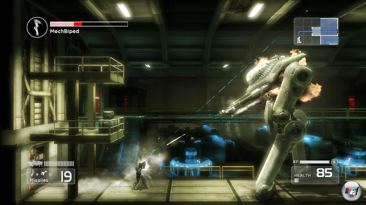 Apropos Bossfights: Die sind eine mittelschwere Enttäuschung. Anfangs freut man sich noch tierisch, wenn man einen mächtig Eindruck machenden Spinnenroboter in einer noch mächtigeren Explosion vergehen sieht – beim dritten Mal allerdings ist die Luft dezent raus. Genau genommen gibt es nur einen Boss (nämlich ein schwer bewaffnetes und gut geschütztes Zweibein), das ein bisschen Taktik
