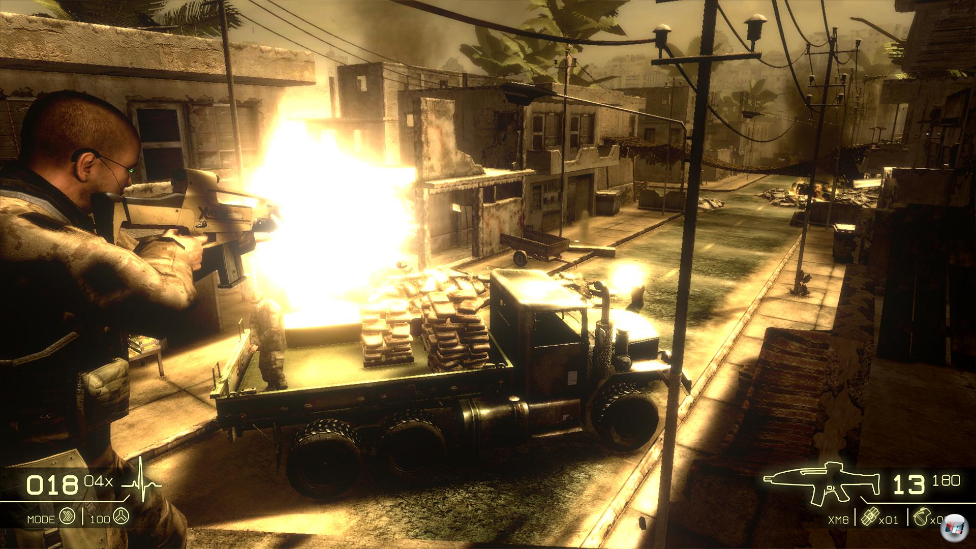 Schon beim schwach inszenierten Intro mit B-Movie-Flair wird deutlich, dass man den Action-Größen wie Battlefield <a class="DYNLINK" onmouseover="DynToolTipp_Show('Klicken für Gameinfos‚)“ onmouseout=“DynToolTipp_Hide(); “ href=“javascript:DynCont_Display(‚Gamefinder‘,’runmod.php?sid=%7BSID%7D&LAYOUT=dyncont_gf&spielid=252053′)“>, Crysis 2 <a class="DYNLINK" onmouseover="DynToolTipp_Show('Klicken für Gameinfos‚)“ onmouseout=“DynToolTipp_Hide(); “ href=“javascript:DynCont_Display(‚Gamefinder‘,’runmod.php?sid=%7BSID%7D&LAYOUT=dyncont_gf&spielid=364773′)“> oder Call of Duty <a class="DYNLINK" onmouseover="DynToolTipp_Show('Klicken für Gameinfos‚)“ onmouseout=“DynToolTipp_Hide(); “ href=“javascript:DynCont_Display(‚Gamefinder‘,’runmod.php?sid=%7BSID%7D&LAYOUT=dyncont_gf&spielid=252123′)“> technisch nicht das Wasser reichen kann, obwohl man den Spielablauf hier nicht aus der Ego-, sondern einer Schulteransicht wie bei Uncharted <a class="DYNLINK" onmouseover="DynToolTipp_Show('Klicken für Gameinfos‚)“ onmouseout=“DynToolTipp_Hide(); “ href=“javascript:DynCont_Display(‚Gamefinder‘,’runmod.php?sid=%7BSID%7D&LAYOUT=dyncont_gf&spielid=11319′)“> oder Splinter Cell <a class="DYNLINK" onmouseover="DynToolTipp_Show('Klicken für Gameinfos‚)“ onmouseout=“DynToolTipp_Hide(); “ href=“javascript:DynCont_Display(‚Gamefinder‘,’runmod.php?sid=%7BSID%7D&LAYOUT=dyncont_gf&spielid=2738′)“> erlebt. Ist man selbst auf den Straßen von Mogadischu unterwegs, wird es nicht besser: Zu trist wirken die langweiligen Kulissen mit ihren Copy & Paste-Gebäuden und groben Texturen, zu hölzern die Animationen der beiden Protagonisten und ihrer Feinde, zu stark die Kanten, die trotz Anti-Aliasing-Option immer noch zum Vorschein kommen. Effekte wie Feuer, Rauch und Explosionen wirken ebenfalls antiquiert – Physik und Zerstörung sind außerdem kaum vorhanden. Kurzum: Shadow Harvest wirkt hoffnungslos veraltet.