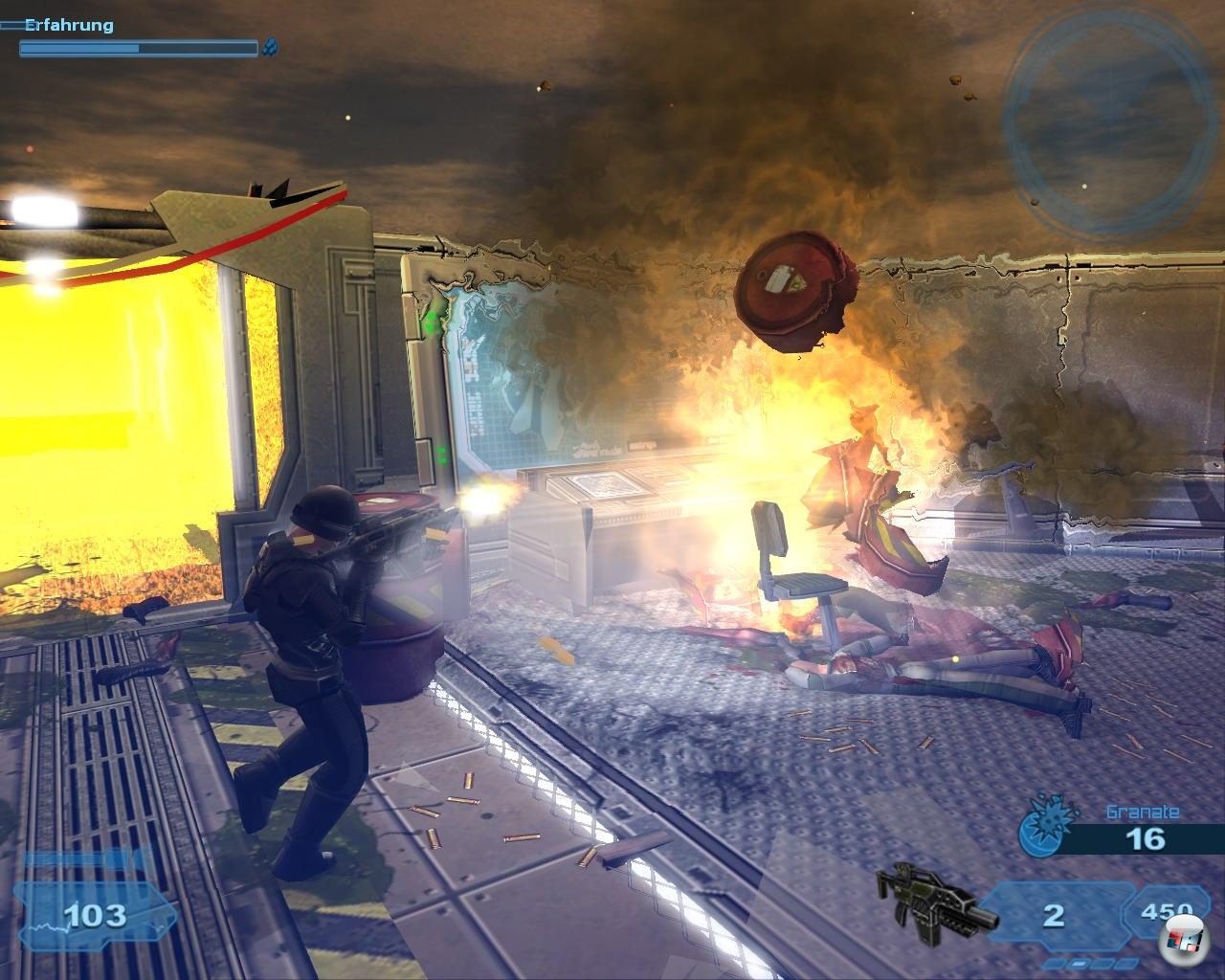 Der Weltraum, unendliche Weiten… alles Quatsch! Shadowgrounds erzählt auch im zweiten Aufguss keine Weltraumoper, sondern missbraucht das coole SciFi-Szenario lediglich als Ausrede für brachiale Zerstörungswut. Das gilt vor allem deshalb, weil heuer nicht nur mit totschicken Schattenwürfen im Lichtkegel der Taschenlampe gespielt wird, sondern weil sich zertrümmerte Kisten, explodierende Fässer und abknickende Bäume realitätsnah verabschieden – den Physikroutinen von Ageia sei Dank. Zusätzlich gibt es dichte Nebelbänke, schmutzigen Rauch sowie verstörende Verzerrungen des gesamten Bildes. Pyromanen erleben außerdem imposant knisterndes Feuer, sobald ihr Flammenwerfer Tacheles spricht oder Öllachen in Brand setzt.