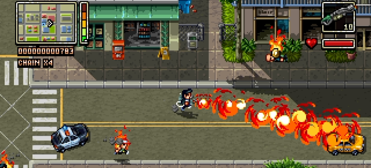 Die Action orientiert sich an den klassischen GTA-Spielen und transportiert sie visuell in die SNES- bzw. Mega-Drive-Ära. © 4P/Screenshot