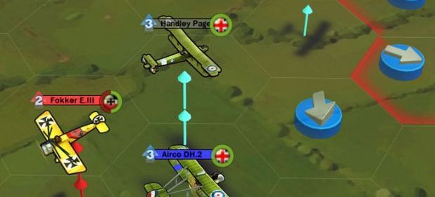Meine Sopwith-Pub-Maschine qualmt und der deutsche Flieger lässt nicht locker. Er hängt wie eine Klette an meinem Heck! Was tun? Gut, dass pausiert wird: Die Pfeile am Hexfeldhimmel zeigen jetzt an, welche Manöver ich fliegen könnte und was das für meine Höhe, mein Tempo sowie meine Lage bedeuten würde. Ich könnte nach links oder rechts schwenken, mich etwas schräg legen, einfach geradeaus weiter fliegen oder mit Speed in einen Sturzflug abtauchen, um weit weg zu kommen. Schade ist: Man kann keine Züge zurücknehmen und wenn sich mehrere Flieger nahe beieinander befinden, kann es trotz optionalem Kameradreh unübersichtlich werden.