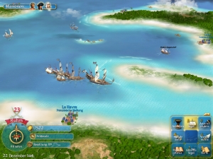 Spiel nicht punkten: Sprachausgabe im klassischen Sinne gibt es nicht, alle Personen brabbeln unverständliches Kauderwelsch, ähnlich wie bei den Sims. Auf See krächzen euch ein paar Möwen um die Ohren, während Meeresrauschen für angenehm meditative Stimmung sorgt. Und die Musik schließlich hat ebenfalls sowohl Licht- als auch Schattenseiten: Auf der einen Seite gehen die schön komponierten Stücke professionell und mit leichten Variationen ineinander über, etwa wenn man von der Stadt aus wieder in See sticht. Auf der anderen Seite klingen die Werke teilweise scheußlich künstlich, gerade die Streicher hören sich nach einem sehr billigen Synthesizer an – gut, das kann man als Retro-Stil durchgehen lassen, es wirkt allerdings fehl am Platze.