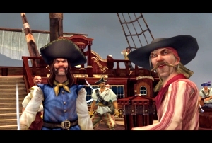wehende Fahnen, im Abendlicht schimmernde Segel, glänzende Metallrüstungen oder schöne Reflektionen auf dem Wasser versüßen das Piratendasein. Bei langen Gefechten geht schon mal die Sonne unter, so dass ihr stufenlos von hellem Licht in pechschwarze Nacht treibt.Getrübt wird das Bild vor allem durch die etwas zuckeligen Animationen, die mäßig animierten Gesichter sowie die ständigen Wiederholungen gleicher Sequenzen. So gibt es z.B. gerade mal eine Hand voll unterschiedlicher Wege, einen gegnerischen Kapitän von seinem Schiff zu befördern – und die sieht man wieder und wieder und wieder. Auch die grob aufgelösten, farbarmen Renderfilme hätte man sich getrost sparen können, bestehen sie doch ohnehin aus abgefilmten Echtzeit-Szenen. Soundtechnisch kann das Spiel ebenfalls nicht punkten: Sprachausgabe im klassischen Sinne gibt es nicht, alle Personen brabbeln unverständliches Kauderwelsch, ähnlich wie bei den Sims. Aus der See krächzen euch ein paar Möwen um die Ohren, während Meeresrauschen für angenehm meditative Stimmung sorgt. Und die Musik schließlich hat ebenfalls sowohl Licht- als auch Schattenseiten: Auf der einen Seite gehen die schön komponierten Stücke professionell und mit leichten Variationen ineinander über, etwa wenn man von der Stadt aus wieder in See sticht. Auf der anderen Seite klingen die Werke teilweise scheußlich künstlich, gerade die Streicher hören sich nach einem sehr billigen Synthesizer an – gut, das kann man als Retro-Stil durchgehen lassen, es wirkt allerdings fehl am Platze.