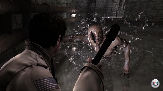 Mit dem rechten Stick kann man sich frei umschauen, ein Druck auf ihn ermöglicht auch eine Egosicht, aber die braucht man zu Beginn nur selten; erst später, in einigen Bosskämpfen, lohnt sich der Zoom ins Fadenkreuz des Gewehrs. An bestimmten Stellen kann man sich auf Knopfdruck durch enge Gänge zwängen, muss hautähnliche Wände aufschlitzen oder über hüfthohe Hindernisse springen. Leider geht das nur da, wo die Entwickler das vorgesehen haben, so dass man manchmal selbst an kniehohen Mauern eines Friedhofs nicht vorbei kommt. Immerhin hat man eine Taschenlampe in all dem Dunkel zur Verfügung, außerdem rauscht das Radio, sobald sich etwas nähert – auch das erinnert ebenso wie die Musik angenehm an alte Zeiten.