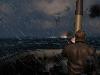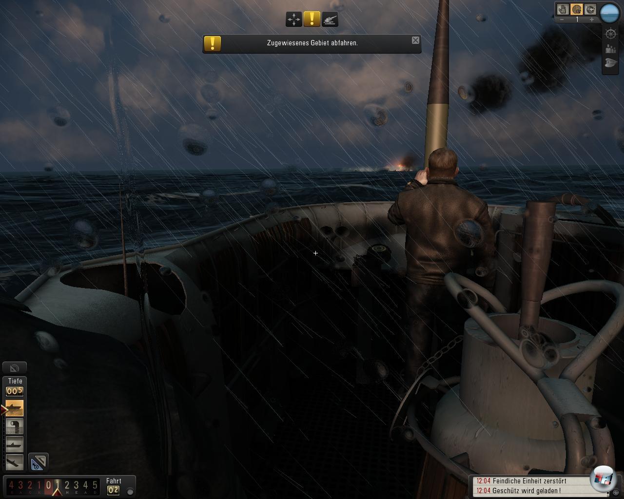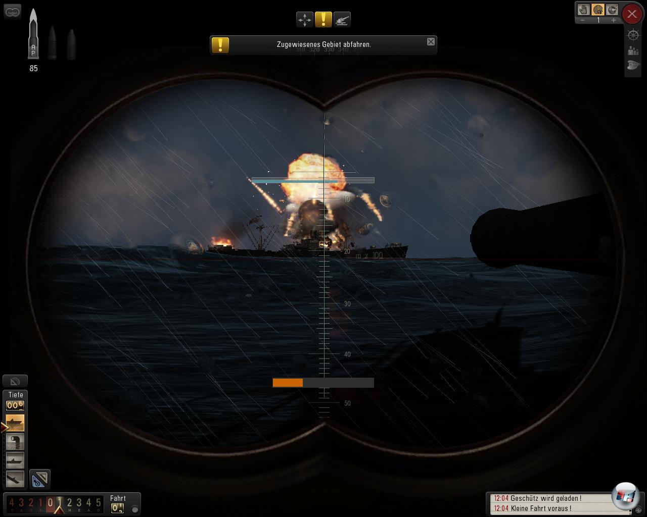 Nach einer Weile höre ich die schnellen Schraubengeräusche über mir und da fallen auch schon die Wabos. „Wassereinbruch“, „Periskop beschädigt“, „Funkgerät beschädigt“..Aua, aua, das hat aber auch gerumst. Zu meiner positiven Überraschung als Tester (nicht Spieler) kann man den Wassereinbruch tatsächlich sehen. Aus allen Ventilen spritzt der Atlantik ins Boot und bildet einen Wasserteppich am Boden – eindrucksvoll. Leider agieren die Charaktere nicht entsprechend. Anstatt emsig mit Reparaturen beschäftigt zu sein, oder panisch vor Angst in den Kajüten zu kauern, stehen alle so rum wie immer – schade, da wäre mehr drin gewesen. In einer recht spartanischen Übersicht die den alten „Christbaum“ vermissen lässt, wird mir nüchtern über Prozentwerte angezeigt wie böse es um mein Boot steht und siehe da – alles halb so schlimm, alles noch im 80% Bereich. Nach einigen Zick-Zack Manövern, aber insgesamt enttäuschend kurzer Zeit, lassen die Zerstörer von mir ab und ich wage den Aufstieg auf Periskoptiefe. Kein Tauchen in kältere Thermalschichten notwendig, kein Werfen von Täuschkörpern, gar nichts – auch schade. Am Horizont sehe ich die drei noch vor der aufgehenden Sonne davonziehen, da mache ich am anderen Ende des Horizonts Rauchwolken aus: Die angeschossenen Handelsschiffe. Zeit für den Nachtisch. Sicherheitshalber bleibe ich noch ein paar Meilen unter Wasser, aber dann geht’s wieder an die frische Luft, die reifen Birnen pflücken. Flugs wird die Deckkanone bemannt und erst der Tanker, dann der Frachter bekommen den Rest. Das Ganze sieht natürlich auch im Tageslicht nicht minder spektakulär aus – im Gegenteil: vor der aufgehenden Sonne werfen die Deckschützen lange Schatten auf das Meer und beängstigend realistisch reckt sich der Bug des Tankers zum letzten Gruß nochmal in die Höhe.