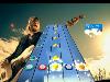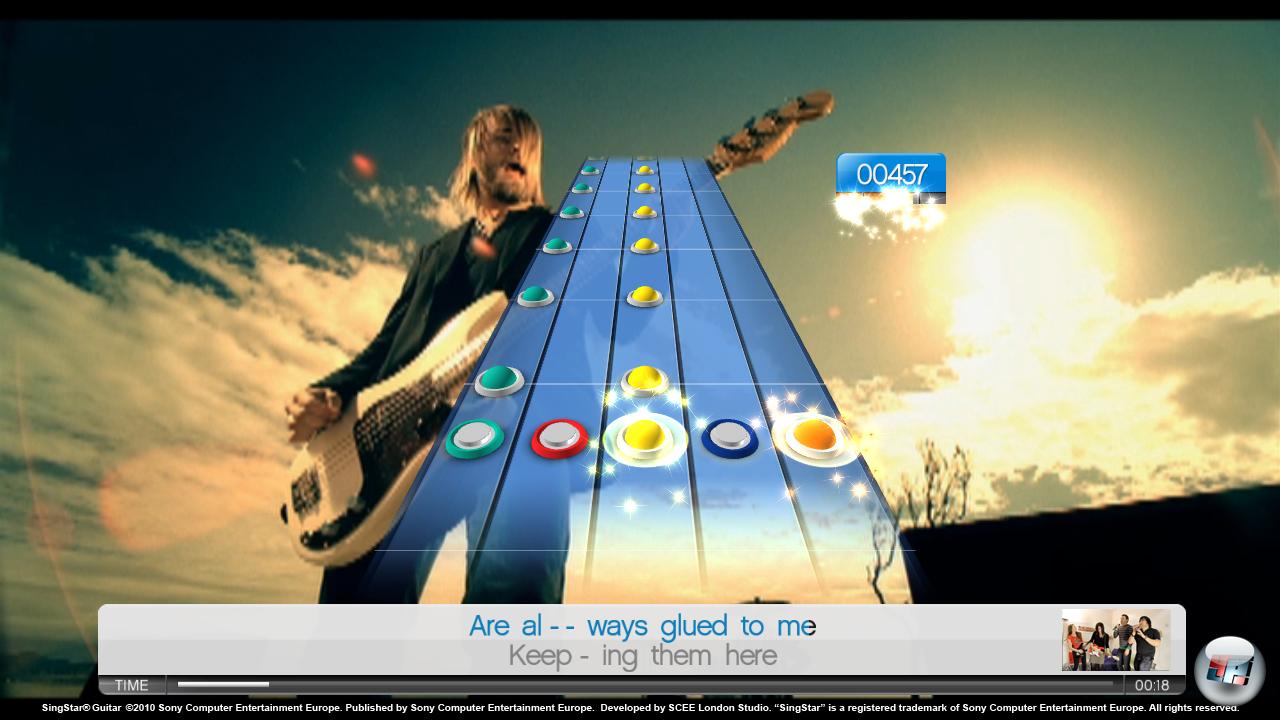 Das Prinzip funktioniert hier ähnlich wie man es bereits aus Guitar Hero & Co kennt: In der bekannten Darstellung scrollen von oben die Symbole für die bis zu sechs Spuren auf die „Trefferleiste“ zu. Dabei gilt es wie gehabt die Pseudo-Noten im richtigen Moment zu treffen oder auch schon mal zu halten. Hammer-ons und Pull-offs gehören ebenso dazu wie Akkorde, bei denen man schon mal bis zu drei Knöpfe gleichzeitig am Gitarrenhals drücken muss. Trotzdem hält sich der Schwierigkeitsgrad verglichen mit den berühmt-berüchtigten Schrammel-Tracks á la Dragon Force oder Metallica in Grenzen: Selbst auf dem höchsten der gerade mal drei Schwierigkeitsgrade erreichen die Notationen vom Anspruch her etwa das Niveau, was bei anderen Musikspielen auf der mittleren Stufe gefordert wird – mit dem Unterschied, dass man ab und zu schon umgreifen muss. Kombos sucht man bei SingStar genau so vergeblich wie die Starpower – das Herumspielen mit der Whammybar dient also lediglich der Klangverzerrung und hat keinen spielerischen Wert. Tatsächlich gibt es keinen großen Unterschied, ob man SingStar mit der Gitarre oder dem Mikrofon in Angriff nimmt: Das maximale Ergebnis beträgt für jeden Song auch mit der Klampfe die üblichen 10000 Punkte, während das Treffen von