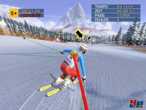 Bereits die erste Übungsabfahrt führt euch die Schnelligkeit des actionreichen Skispiels vor Augen, dessen Steuerung zugleich derart butterweich funktioniert. Nur wenige Tasten sind nötig, um euren Rennfahrer auf der schmalen Piste zu halten. Große Pfeile sorgen dafür, dass ihr auch keine Stange überseht. Nachdem ein Patch die Probleme beseitigt hat, könnt ihr wahlweise auch per Gamepad spielen. Für die vier Disziplinen ist natürlich jeweils ein ganz anderer Fahrstil angesagt: Während ihr bei der Abfahrt