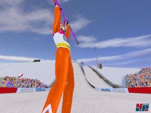 An der recht bunten 3D-Grafik fällt vieles negativ auf, allen voran die ungelenken Animationen der Springer selbst. Beim Sturz etwa rutscht der gute Mann kilometerweit steif und ohne sich zu bewegen, richtet sich dann seltsam auf, nur um zu winken, als ob nichts passiert wäre. Verzeihlich ist bei den polnischen Entwicklern eher, dass manch eine der Nationalflaggen nicht stimmt. Unverzeihlich hingegen wie diese wie Blechplatten im Wind „flattern“. Grafikfehler sind ebenfalls zur Genüge zu beobachten. Unscharf sehen die mit hässlicher Pünktchenschrift versehenen Menüs aus, die es nur in 800×600 gibt. Die Schanzen sind im Wesentlichen korrekt dargestellt, stehen aber von Norwegen bis Japan in immer der gleichen winterlichen Berglandschaft.