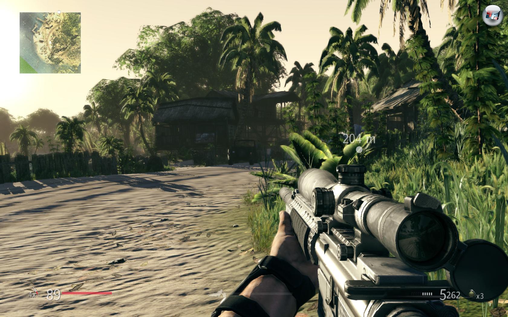 So stelle ich mir einen Karibik-Urlaub vor: Über mir neigen sich Palmwedel sachte im Wind, vor mir glitzert das azurblaue Wasser und dahinter bietet sich ein wunderhübsches Panorama. Aus dem dicht überwucherten Dschungel ragen ein paar zerklüftete Felsen hervor, auf welchen ich selbst durch das Zielfernrohr noch brüchige Feinheiten erkennen kann. Auch das Hamburger Wetter spielt mit und sorgt für tropische Temperaturen in unserem Konsolenbüro. Auf visueller Ebene haben sich die Entwickler von City Interactive sich mächtig ins Zeug gelegt – zumindest auf den ersten Blick.