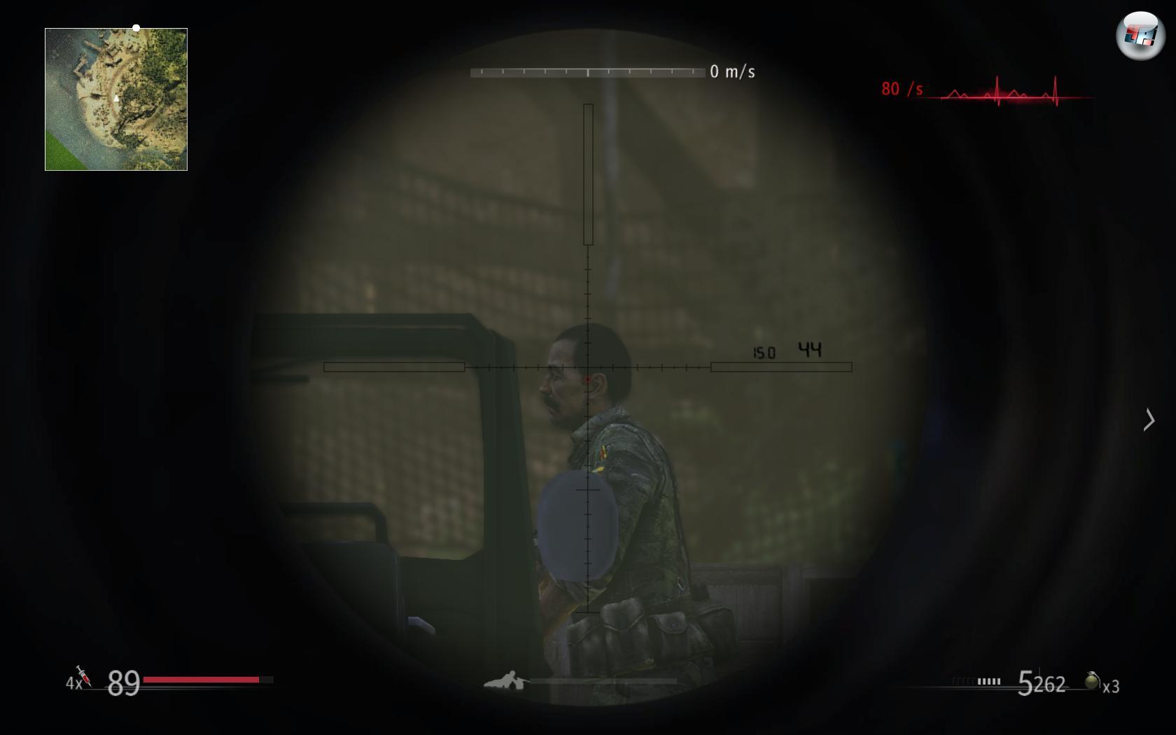 | Im Zielfernrohr werden Wind und Herzfrequenz angezeigt. Dank roter Einschlags-Markierung und Zeitlupe trifft man meist todsicher. (PC) |