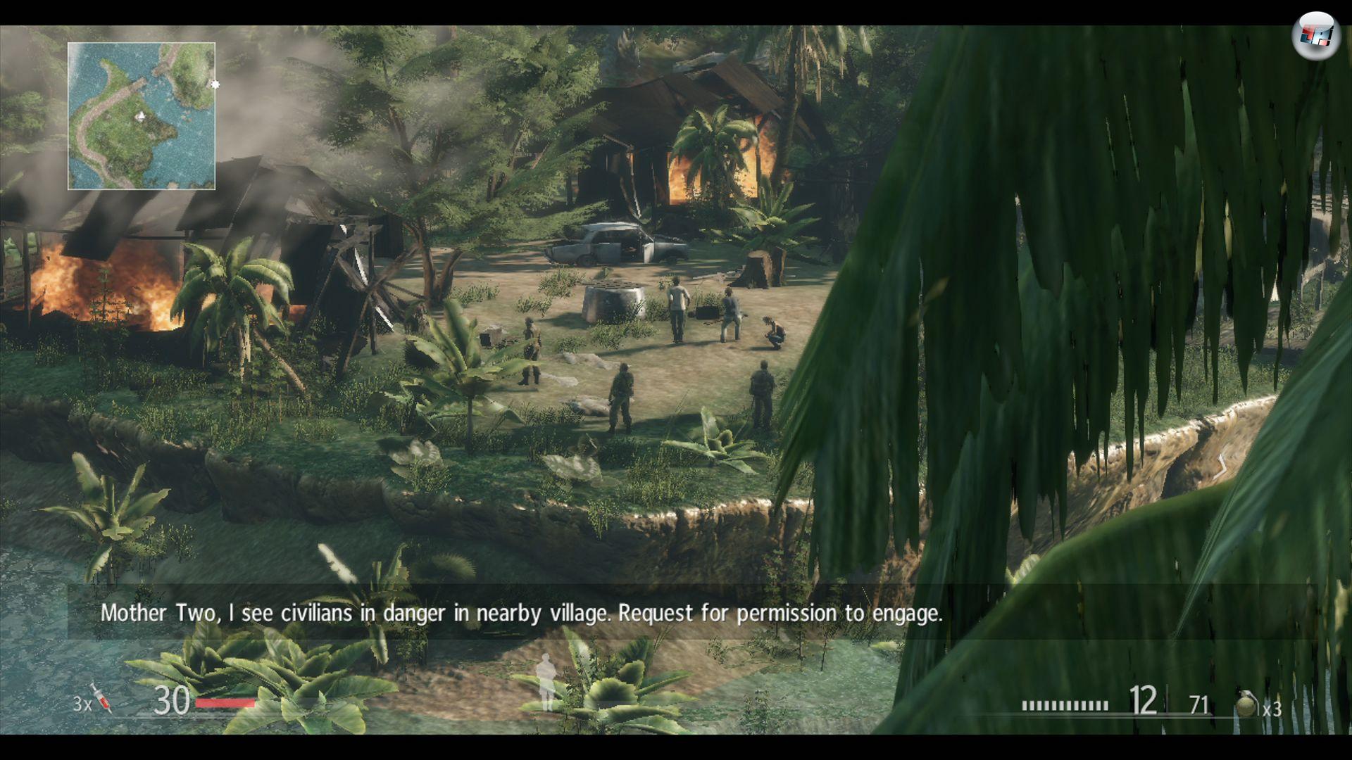 in die entsprechende Richtung lotsen wollte und das dichte Buschwerk eine ausgezeichnete Deckung abgegeben hätte, musste ich einen weiten Bogen um die unsichtbare Grenze machen. Wenn diese Barrieren fehlen, ist es aber recht motivierend, den idealen Weg auszuarbeiten. Als ich manche Abschnitte auf der Xbox 360 zum zweiten mal gespielt habe, bin ich dank meiner Map-Kenntnis um Längen cleverer vorgegangen. Statt meine Gegner noch einmal aufzuscheuchen, bin ich lieber am Großteil von ihnen vorbeigeschlichen oder habe sie lautlos mit dem Wurfmesser erledigt. Das Ergebnis: Ich musste nur noch selten zur Waffe greifen und einen Bruchteil meiner Widersacher ausschalten. An anderer Stelle bin ich im zw