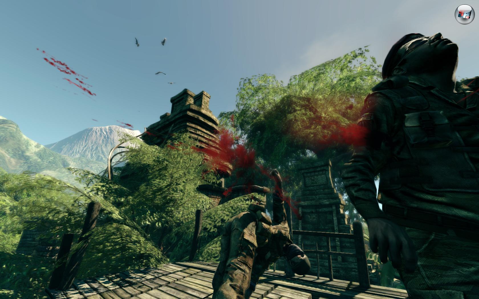 Schade, dass es in Sniper: Ghost Warrior keine Stealth-Finessen wie das Verstecken von Leichen gibt. Stattdessen steht ab und zu sogar schnelle Run-and-Gun-Action auf dem Programm. In manchen Abschnitten schlage ich mich im Stil von Call of Duty mit dem Sturmgewehr durch feindliche Linien. Die Abschnitte als lautloser Scharfschütze fallen aber deutlich unterhaltsamer aus, da die Soldaten im Nahkampf nicht so clever agieren wie in anderen bekannten Shootern. Wechsle ich z.B. nach einem Speicherpunkt von einem Stützpunkt in den angrenzenden Dschungel, kümmern sich die Gegner hinter mir kaum noch um mich – ganz so, als sei es nicht mehr ihr Zuständigkeitsgebiet.