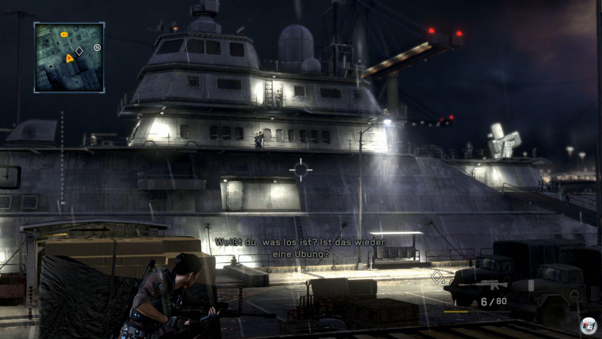 Ähnlich wie in Gears of War oder älteren Socom-Teilen schaue ich meinem Krieger über die Schulter, während ich durch eine verlassene Stadt laufe. Am Horizont ragen zwei gigantische Wolkenkratzer in den Himmel – davor liegen die Überreste eines kollabierten Fernsehturms auf dem Betonboden. Nur wenn ich mich direkt vor eine Mauer stelle, verwandeln sich die feine Risse und Steinstrukturen in einen unscharfen Texturbrei. Mit der Detailfülle eines Uncharted 2 kann die von der überarbeiteten MAG-Engine berechnete Szenerie nicht konkurrieren und auch die Charaktere bewegen sich etwas weniger natürlich – trotzdem kann sich das Gebotene sich durchaus sehen lassen.