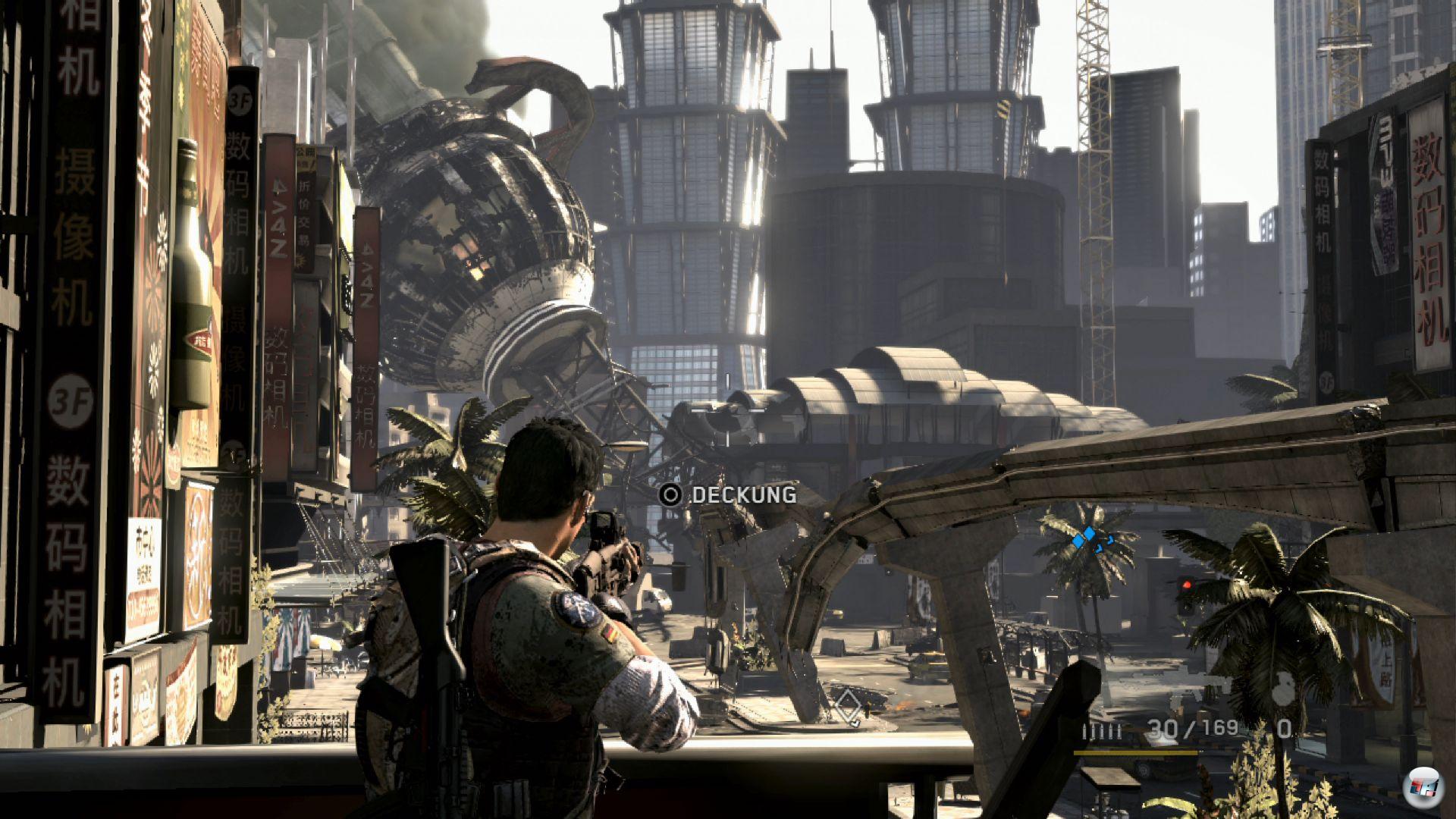 Besitzer eines 3D-Fernsehers bekommen das Kriegs-Szenario noch räumlicher zu Gesicht. Der Effekt wirkt natürlich bei weitem nicht so spektakulär wie in Killzone 3 oder Motorstorm mit all seinen Trümmern, welche direkt an der Kamera vorbei zischen. Stattdessen gibt es eine dezente, aber gelungene räumliche Darstellung, bei der sich Stärke und Tiefe des 3D-Effekts stufenlos einstellen lassen. Leider geht hier die Bildrate ein wenig in die Knie – allerdings nicht so weit, dass der Spielfluss beeinträchtigt wird. Außerdem besitzt das Spiel eine optionale Move-Steuerung, welche ähnlich funktioniert wie die in diversen Wii-Shootern: In der Mitte des Schirms ziele ich direkt auf meine Gegner. Bewege ich Zielkreuz an den Rand, beginnt der Bildschirm, sich dorthin zu drehen. Wie üblich dürfen die Größe dieser beiden Bereiche und die Empfindlichkeit stufenlos verändert werden. Gelaufen wird wie gewohnt mit dem Analogstick des zusätzlichen Navigation-Controllers (oder dem Stick eines normalen Dual-Shock-Controllers). Wer sich ein wenig in die Move-Steuerung hineinfuchst, kann sein Zielkreuz schneller zu einem Widersacher huschen lassen als mit dem rechten Analogstick. Andererseits erweist sich das Drehen der Kamera als deutlich schwammiger, daher bin ich nach einiger Zeit wieder auf die klassische Variante umgestiegen. Auch Sonys optional erhältlicher Waffen-Aufsatz »Sharp Shooter« wird unterstützt – ein Special zu der knallroten Hardware findet ihr hier.