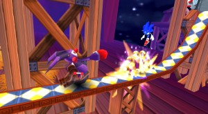 sein: »Hey, da vorn ist unser alter Erzfeind Eggman. Was hat der Hund gemacht? All unsere Freunde mit einer Spezialkamera in Spielkarten verwandelt? Rache! Den kriegen wir! Und hey – lass uns gleich ein Wettrennen machen, während wir ihn verfolgen!«.