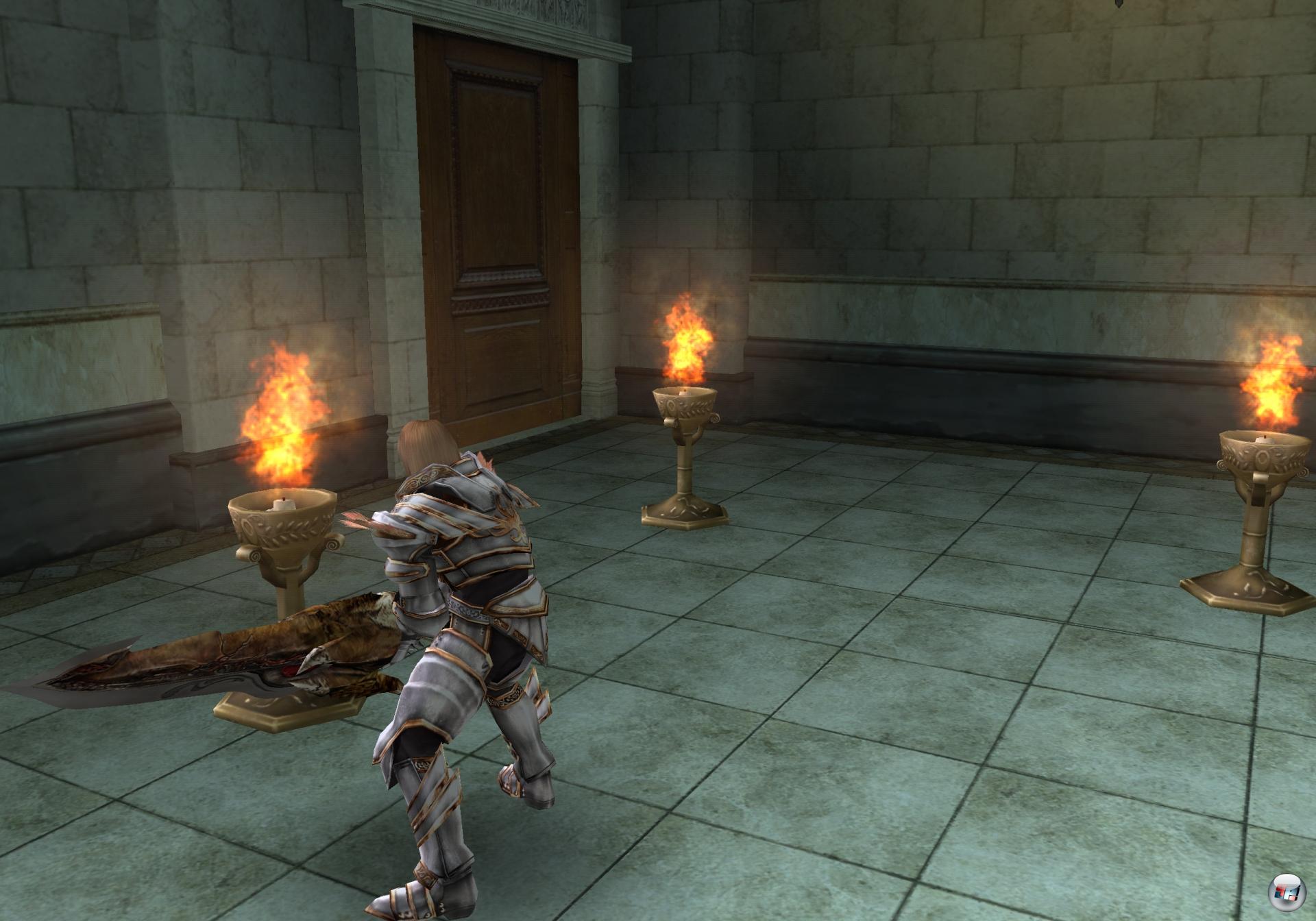 Ödes Rätselraten: Löscht alle Flammen mit Schwerthieben und der Weg ist frei.