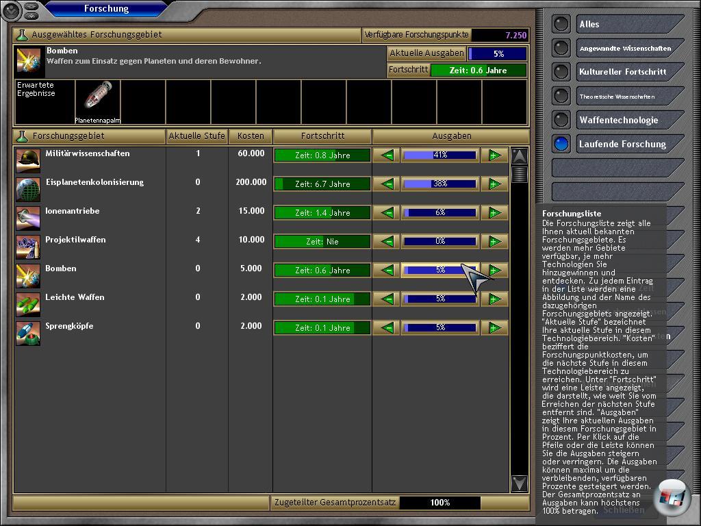 überraschend oder gar abwechslungsreich. Aber es gibt viele aus unterschiedlichen Bereichen wie Theorie, angewandte Technik, Militär oder Kultur. Bevor ihr praktische Erfindungen machen könnt, müsst ihr erst einmal die zugrundliegende Theorie erforschen. Wenn ihr also neue Waffen wollt, müsst ihr zunächst die Militärwissenschaft erforschen. Ihr habt einen Forschungsetat, der aus eurem Labors stammt und den ihr prozentual auf die zu erforschenden Technologien verteilt.