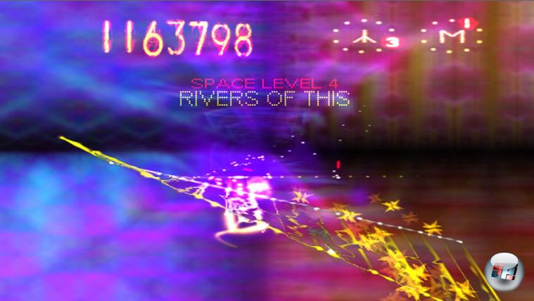 Ein weiteres zweischneidiges Schwert sind auch die Schüsse eurer Gegner: Wenn diese euch treffen, ist ein Leben futsch. Aber andererseits könnt ihr sie mit euren eigenen Projektilen in die entgegengesetzte Richtung zurück bugsieren. Dann drehen sie eine Runde durch das Weltall im Hintergrund und erscheinen nach ein paar Sekunden wieder auf dem Gitter.