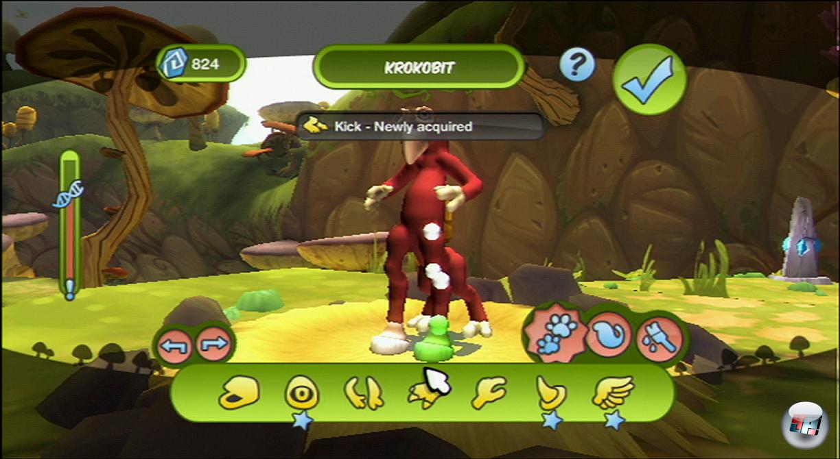 Mein eigenes Wesen kann ich übrigens nicht immer nach Herzenslust mit allen verfügbaren »Ersatzteilen« ausstatten. Freigeschaltete Beißer, Hörner und Klauen müssen vorher mit blauen Kristallen bezahlt werden, welche in den Levels verstreut liegen. Ab und zu muss ich abwägen, welches Körperteil gerade dringender gebraucht wird: Stehe ich vor einer großen Schlucht, sind Gleitflügel Pflicht; vor einem schweren Kampf sollte ich sie aber für stärkere Hauer opfern. Auch im Duellmodus für zwei Spieler müssen die Kontrahenten ihren Kämpfer ausbalancieren. Zur Wahl stehen einige freigeschaltete Charaktere aus dem Abenteuer und eigens geschaffene Geschöpfe aus dem Editor. Leider gibt es nur extrem simpel gehaltene Matches über zwei Runden. Es stehen weder Turnier-Modi, noch Online-Matches oder andere Mehrspieler-Finessen zur Auswahl – hier hat EA massiv Potential verschenkt. Wer mit seinen Spore-Monstern online antreten will, muss also wohl oder übel auf das DS-Spiel Spore Helden-Arena <A class=DYNLINK onmouseover="DynToolTipp_Show('Klicken für Gameinfos‚)“ onmouseout=“DynToolTipp_Hide(); “ href=“javascript:DynCont_Display(‚Gamefinder‘,’runmod.php?sid={SID}&LAYOUT=dyncont_gf&spielid=255193′)“>