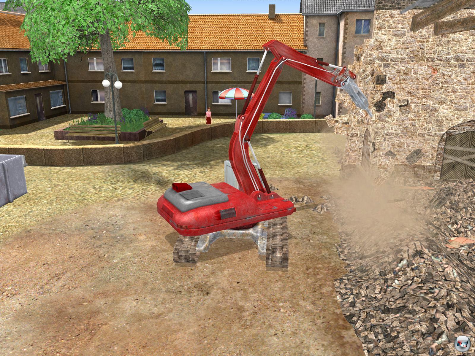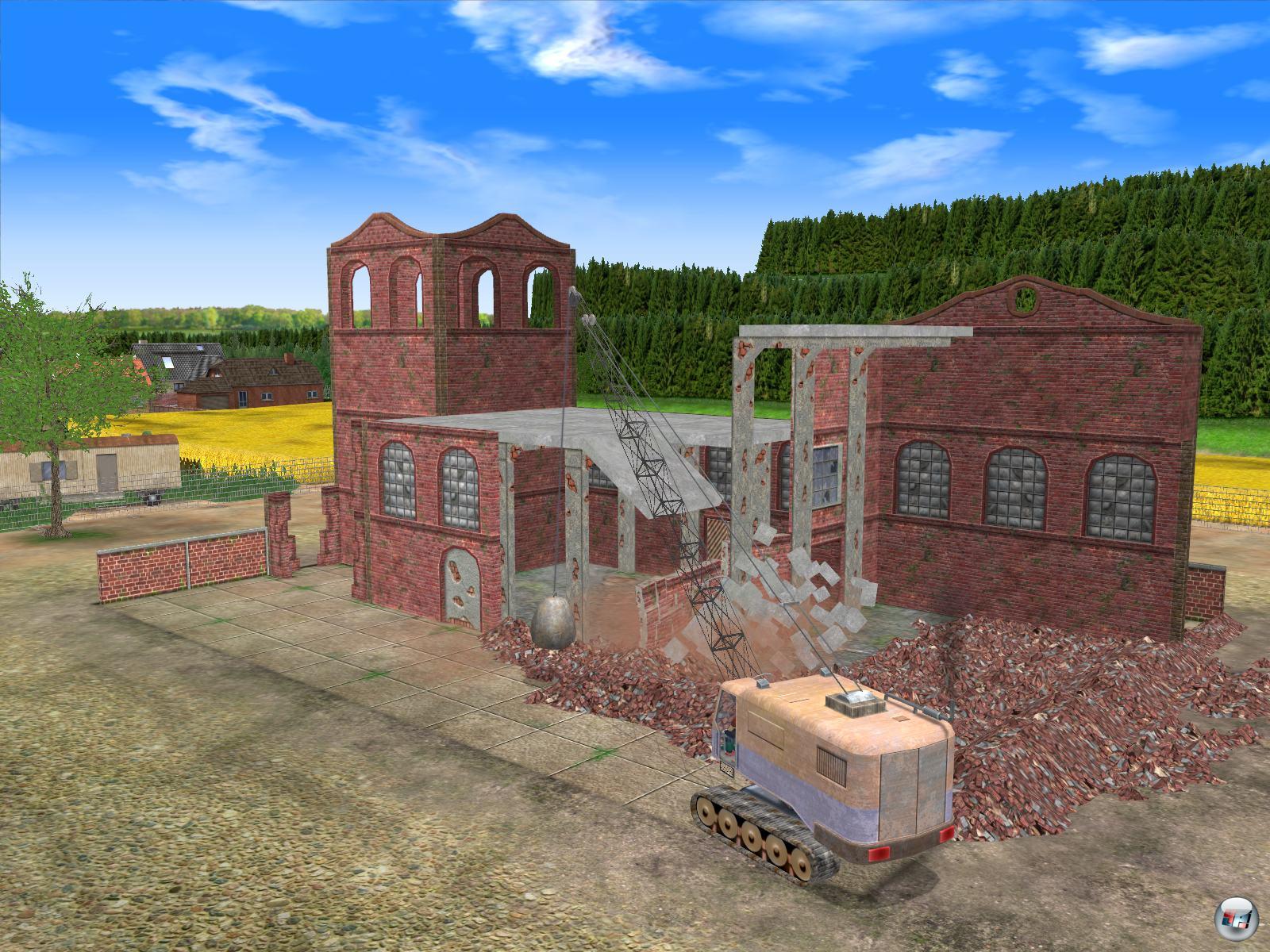 Wer wollte nicht schon immer mal mit einem Abrissbagger oder einem Kran, an dem eine gigantische Abrissbirne baumelt, ein riesiges Gebäude dem Erdboden gleichmachen? In zwölf Einsätzen wird einem dies hier ermöglicht. So sollen unter Verwendung verschiedener »Rückbautechniken« unterschiedliche Aufgaben erledigt werden. Da muss z.B. eine alte Kirche zunächst einem Voll- und dann einem Teilabriss unterzogen, oder gleich eine ganze Siedlung dem Erdboden gleich gemacht werden. Auch Hochhäuser dürfen gesprengt werden und sogar ganze Kraftwerke. Hierbei kommen unterschiedliche Techniken zum Einsatz, deren Handhabung per Tutorial vermittelt werden. Und wie Bob der Baumeister, verfügt man über einen kleinen Fuhrpark von Maschinen, mit denen sich so einiges platt machen lässt. Da wäre zum einen der Abrissbagger: Im Grunde ein klassischer Bagger, nur eben ohne Schaufel, stattdessen mit fiesem Hydraulikschlaghammer an der Spitze. Mit diesem werden die entsprechenden Gebäudeteile quasi »punktiert« bzw. so »gestanzt«, dass sie nachgeben und zusammenbrechen – tragende Teile eignen sich da natürlich ganz besonders. Wer nicht so »filigran« sondern robuster vorgehen will, kann sich mit der Abrissbirne schon besser austoben, denn hier heißt es nur: Ausholen, Schwung nehmen und Wumms, ab durch die Mauer! Mit Bulldozern, Laderaupen und Kippern wird der Schutt anschließend beseitigt, wobei das dann stark an den Baggersimulator aus dem letzten Jahr erinnert; schließlich handelt es sich um denselben Entwickler.![]()
