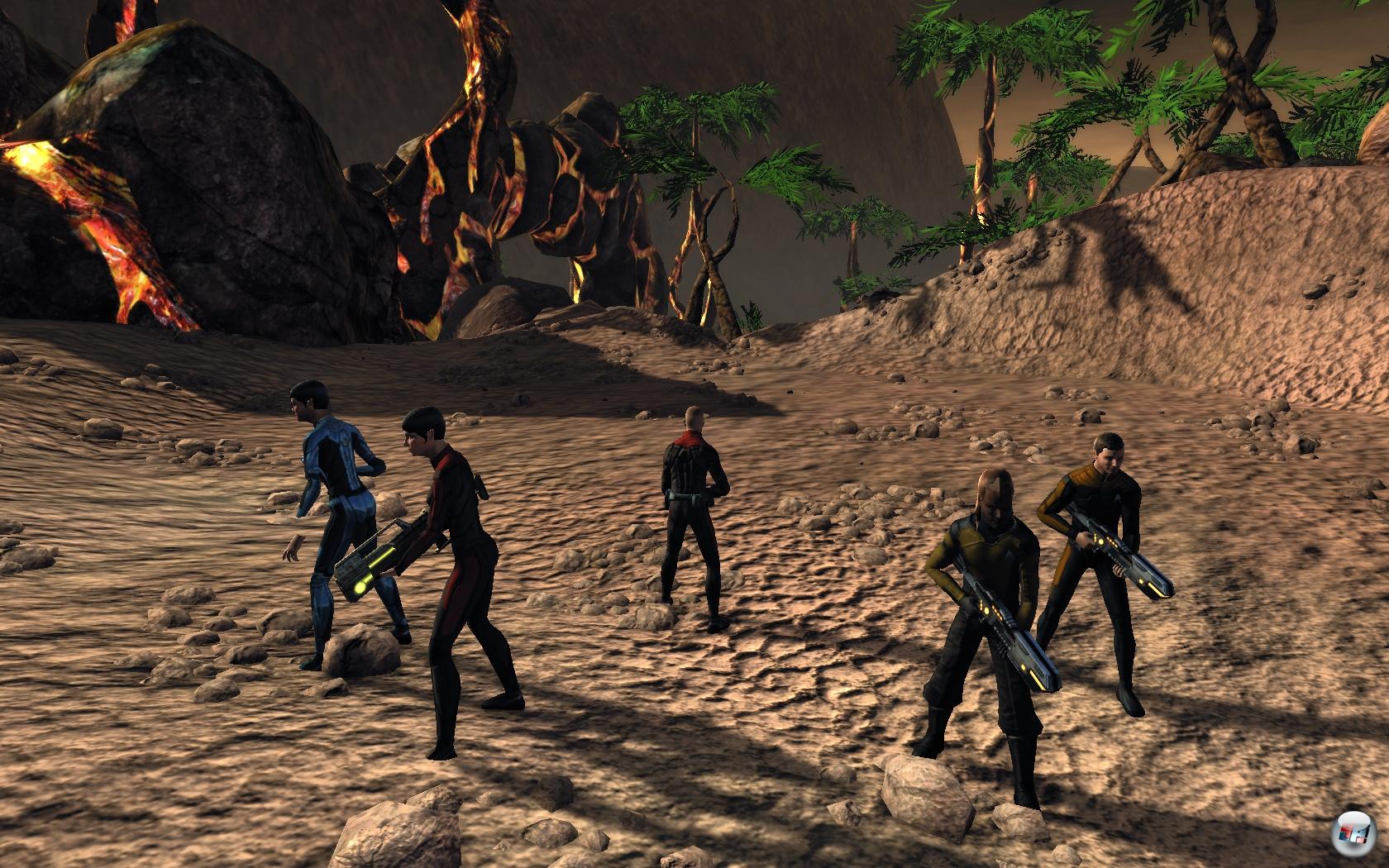 Das zweite Standbein sind die Bodenmissionen – und hier wackelt Star Trek Online gewaltig. Aus der 3rd-Person-Perspektive steuert man den Captain höchstpersönlich über Planten oder durch Raumstationen und wird dabei von den computergesteuerten Brückenoffizieren (tolle Idee!) oder anderen