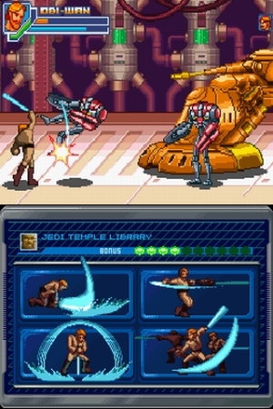 Die 3D-Szenen sind dagegen nicht ganz so gelungen: Zwar läuft die Grafik auch sehr flüssig, aber es mangelt an Details – und auf Coruscant beleidigt ein potthässlicher Distanznebel das Jedi-Auge. Doch fetzige Explosionen und adrenalinreiche Scharmützel trösten über diese Mängel hinweg. Euer Abenteuer wird von der Original-Musik aus der begnadeten Feder von John Williams begleitet, welche perfekt zu den Kämpfen passt und z.B. beim Endkampf (untermalt von »Duel of the Fates« aus Episode 1) für erhabene Stimmung am DS sorgt. Dazu gibt es sehr gute, ebenfalls originalgetreue Stereo-Soundeffekte wie brummende Lichtschwerter, zischende Laser und schnarrende Roboter.