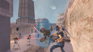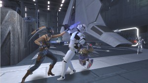 annimmt. Dass nur zwischen den Levels gespeichert werden kann, ist nicht ganz so schlimm, schließlich sind selbige recht kurz. Aber Ubisoft hat auch die Chance verschenkt, einen sinnvollen Star Wars-Bonus zu erschaffen: Zwar trefft ihr auf viele bekannte Charaktere wie Kyle Katarn, Prinzessin Leia, Boba Fett oder einen dicken Rancor, doch darüber hinaus bleibt das Spiel farbarm – man kann nur mit wenigen Personen reden, die Story tröpfelt bedächtig vor sich her. Und der Mehrspielermodus ist nicht der Rede wert: Ihr dürft euch lediglich mit einem weiteren UMD-Besitzer in einer Art Deathmatch balgen, in dem ihr euch frische Upgrades kaufen dürft.