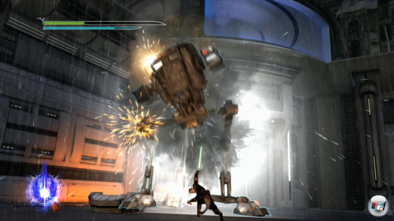 wieder und wieder und immer wieder über den Weg. Doof ist zudem, dass die Feinde ausschließlich durch Masse und nicht durch Klasse bestechen und sich immer auf absolut identische Weise zerlegen lassen – was wörtlich zu nehmen ist, denn mit den Lichtschwertern trennt man gelegentlich das eine oder andere Körperteil ab. Wenn man das erste Mal einen AT-ST zersäbelt, während orange glühende Teile links und rechts regnen, dann denkt man nur »saugeil!«. Nachdem man das das vierte, fünfte, sechste, siebte und achte Mal auf die exakt gleiche Weise gemacht hat, gefolgt von der exakt gleichen Animation, beginnt die faszinierende Fassade erheblich zu bröckeln. Viel zu oft fällt den Designern nach einer fetten Gegnerwelle nichts anderes ein, als direkt noch eine hinterher zu schicken – diese Art von Design gehört in Serious Sam, nicht in ein Star Wars-Spiel! Auch das Kampfsystem könnte interessant sein, ist es aber nicht: Theoretisch kann man Angriffe wild kombinieren, normale Schläge mit Machtblitzen oder -stößen anreichern – braucht man aber nicht, zumindest nicht auf dem normalen Schwierigkeitsgrad. Hier reicht in den allermeisten Fällen stupides Drücken der Angriffstaste völlig aus.