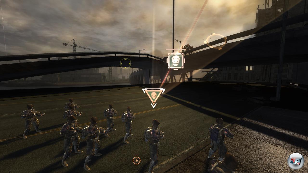 Spieler: Ja, schon. Wenn man „Select“ drückt, darf man sich über die nervöseste und unbrauchbarste Strategiekarte des Genres ärgern. Anstatt hier eine ruhige Perspektive inkl. Befehlsgewalt anzubieten wie in EndWar, schwenkt das Ganze wie ein Schiff auf hoher See hin und her, wenn man den Analogstick nutzt – und richtig planen kann man da gar nichts. Also bleiben die spärlichen Orientierungshilfen in der Spielwelt – die Icons, die das nächste Ziel anzeigen: Gut ist, dass man alle wichtigen Orte, Freunde und Feinde auf der Karte auch über ihre Anwahl erreichen kann. So kann man selbst einen weit entfernten, noch gar nicht sichtbaren Energiepunkt erreichen oder einem entfernten Verbündeten den Befehl geben, sich selbständig wieder zurück zur Truppe zu begeben. Aber erstens ist die Wegfindung nicht das Gelbe vom Ei und zweitens schickt man seine Jungs auf diese Art fast immer in die ewigen Jagdgründe – weil sie sich strunzdumm verhalten, weil ich sie manuell postieren muss. Das wäre ja alles in Ordnung, aber man verliert einfach die Orientierung!
