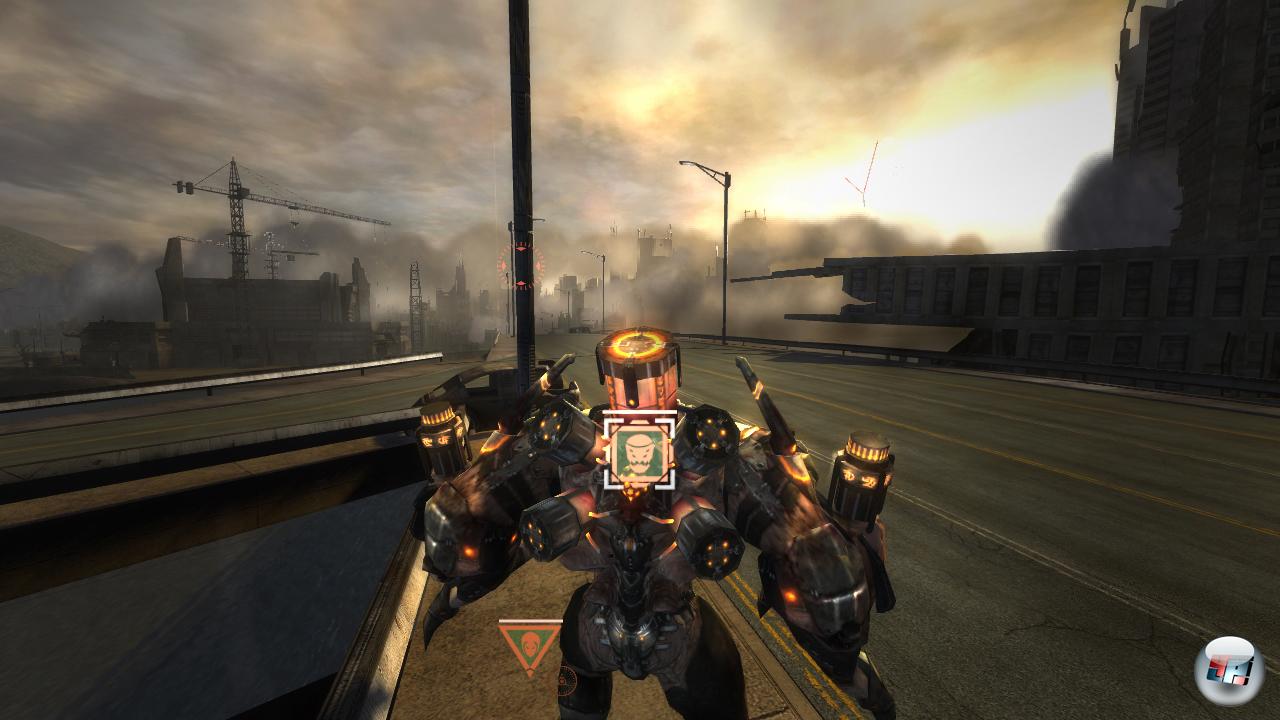 Ersteres bedeutet, dass man sowohl in der Höhe als auch in der Tiefe kämpft, dass man Truppen also sowohl auf Hochhäusern platzieren als auch durch Katakomben führen kann. Wenn man die mechähnlichen Helden samt Truppenbegleitung in Schulterperspektive durch die riesigen Höhlen führt, kommt sogar fast Dungeonstimmung auf. Aber das Spiel fühlt sich so verdammt indirekt an und die Ausführung der Befehle ist sauträge: Ich klicke auf einen Punkt am Boden, mein Mech stapft hin und erst, wenn er ankommt, dann schießt er! Genau so dämlich passiv verhalten sich meine Bodentruppen – ist das realistisch? Nein! Suchen sie mal selbstständig Deckung? Nein! Und wissen sie, was passiert, wenn sich meine Einheit auf einen Punkt hinter einer gegnerischen bewegen soll? Sie läuft einfach durch sie hindurch! Kein Nahkampf, kein Stoppen, keine Action! Und überhaupt: Die Spielwelt ist groß, aber so verdammt steril, weil man selten überrascht wird und weil das Artdesign einfach nicht rockt – es fehlen Details und coole Animationen. Die Truppen zuckeln regelrecht über das Schlachtfeld, postieren sich wie Lemminge auf einem Haufen und schießen durch ihre eigenen Leute hindurch. Ist grafisch so eine Art Halo Wars für Arme mit guter Weitsicht.