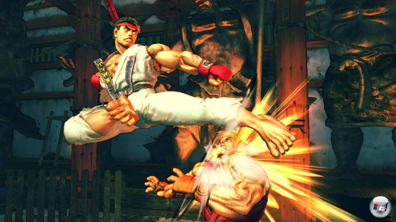 Naja, egal: Das Menü, überwacht von einem grimmig dreinblickenden Ryu, ist so spartanisch wie nötig – Arcade, Versus, Online, Challenge und Training werden feilgeboten, eine Karriere oder Vergleichbares gibt es nicht. Zwar werden die Solo-Arcade-Spiele von unspektakulären Anime-Filmchen umrundet, aber das war’s auch schon. Dem »Zurück zu den Wurzeln«-Credo folgend ist der Kampf Mann gegen Mann der Kern des Spiels, was natürlich am Einfachsten im VS-Modus ausgelebt werden kann: Jeder wählt seinen Fighter, stellt die Farbe der Klamotten ein (sie wird direkt gewählt, nicht indirekt über die Knöpfe wie bisher), maximiert oder minimiert seine Siegchancen durch Handicaps – und dann geht’s auch schon los, zackzack, knuffknuff, starke Schläge, schwache Schläge, mächtige Tritte, fliegende Feuerbälle, Sonic Booms noch und nöcher. Street Fighter war und ist ein schnelles Spiel, das auf flotte Reflexe, perfekte Blocks und idealerweise übermenschliche Vorahnung des nächsten Moves basiert – im vierten Teil ist das nicht anders.