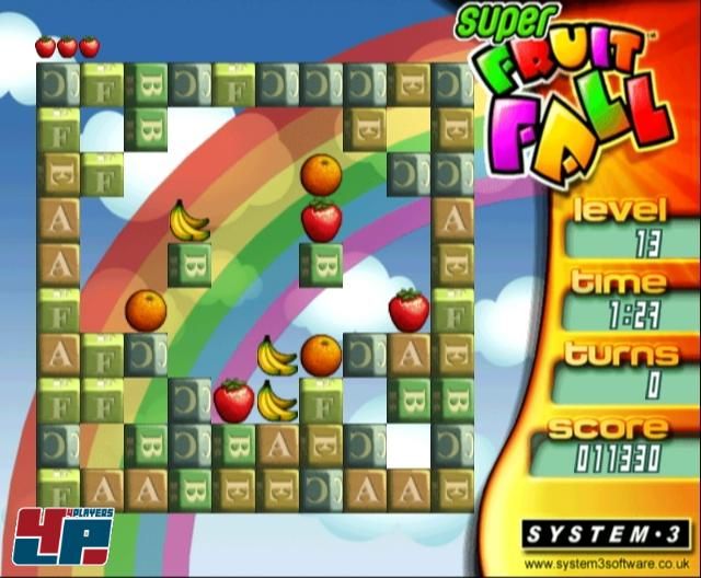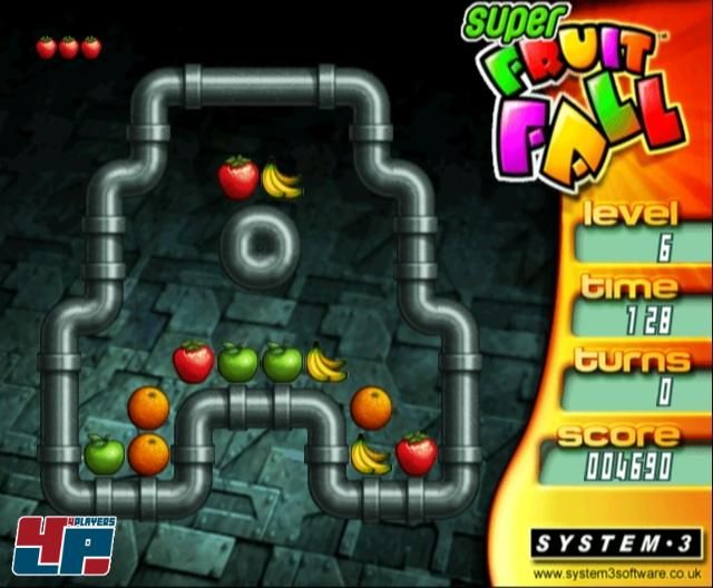 uns typischen, atemberaubenden Graphik und dem (…).“ Hier hat Mark Cale von System 3 ein ganz klein wenig übertrieben. Oder er ist in der ruhmreichen Vergangenheit von The Last Ninja stecken geblieben. Super FruitFall <a class="DYNLINK" onmouseover="DynToolTipp_Show('Klicken für Gameinfos‚)“ onmouseout=“DynToolTipp_Hide(); “ href=“javascript:DynCont_Display(‚Gamefinder‘,’runmod.php?sid=%7BSID%7D&LAYOUT=dyncont_gf&spielid=10849′)“> könnte nämlich auch auf dem SNES genau so laufen oder als 1-MB-Flashgame, so spartanisch ist es gestrickt. Bis auf fallende Früchte und drehende Levels tut sich gar nichts – statische Hintergründe, keine Bewegung im Raum, keine feinen Animationen. Auch wenn Wii nicht Next-Generation sein will, hat Rayman: Raving Rabbids <a class="DYNLINK" onmouseover="DynToolTipp_Show('Klicken für Gameinfos‚)“ onmouseout=“DynToolTipp_Hide(); “ href=“javascript:DynCont_Display(‚Gamefinder‘,’runmod.php?sid=%7BSID%7D&LAYOUT=dyncont_gf&spielid=9869′)“> gezeigt, dass auch New-Generation verdammt cool aussehen kann. Und auch wenn man den Vollpreishasen nicht nacheifern will und kann, sollte man den Auftritt auf dem Wii möglichst markant inszenieren.