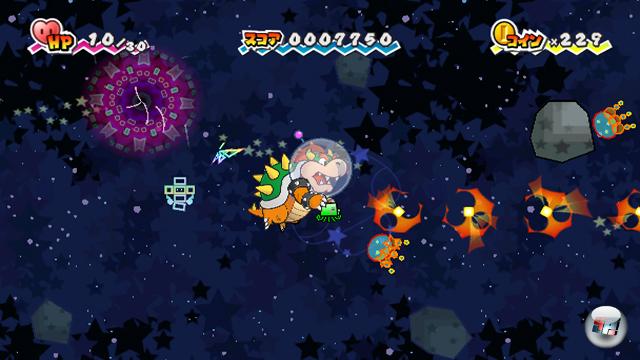 Und spätestens im Weltall-Abschnitt, in dem Mario samt Anhängern zum Raumschiff in einem Vertikal-Shooter umfunktioniert wird, werden sämtliche Genregrenzen gebrochen und man staunt nur noch ob der teils wahnsinnigen Fantasie, die die Entwicklung angetrieben haben muss…