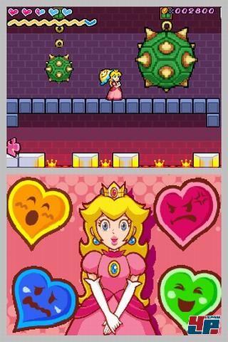 Apropos: Die DS-Extras werden wie so oft entweder nur beiläufig oder erschreckend abwegig benutzt. An das Aktivieren der Vibes per Touchpad gewöhnt man sich schnell, aber sonst kommt es nur vor dem Bosskämpfen zum Einsatz – da müsst ihr mal Plattformen wie Gummi spannen, um die Prinzessin immer höher zu schnipsen, einen Baumstamm drauflosrollen oder der fallenden Peach Hindernisse aus dem Weg stupsen. Gelegentlich wird sogar das