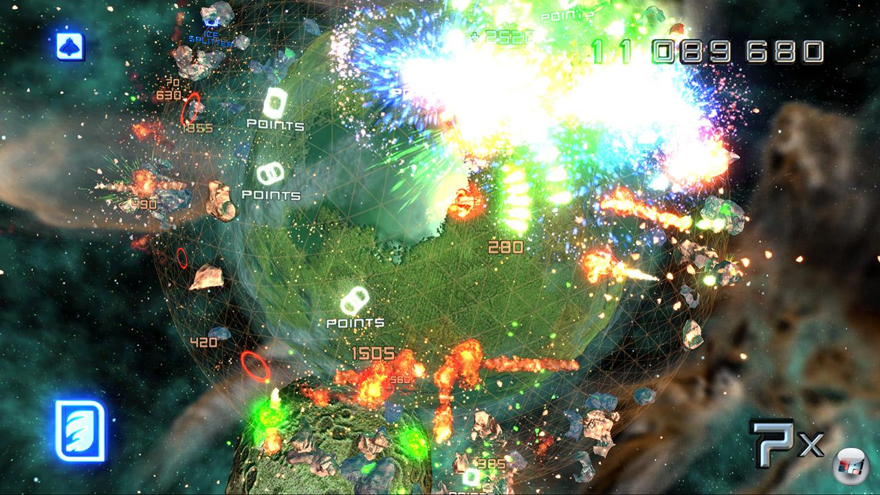 Da ihr auf diese Weise viel mehr Widersacher erledigt, haben die Entwickler die Levels dementsprechend vollgestopft. Ähnlich wie in Geometry Wars fliegt ihr durch riesige Heerscharen von rotierenden Gesteinsbrocken und feindlich gesinnten Raumgleitern. Aufgrund des kugelrunden Planeten bleibt zwar mehr Platz zum Ausweichen. Doch trotzdem wird das Spiel zu einem blitzschnellen Reaktionstest, der in jedem Sekundenbruchteil eure komplette Aufmerksamkeit fordert, bis die Augen tränen.